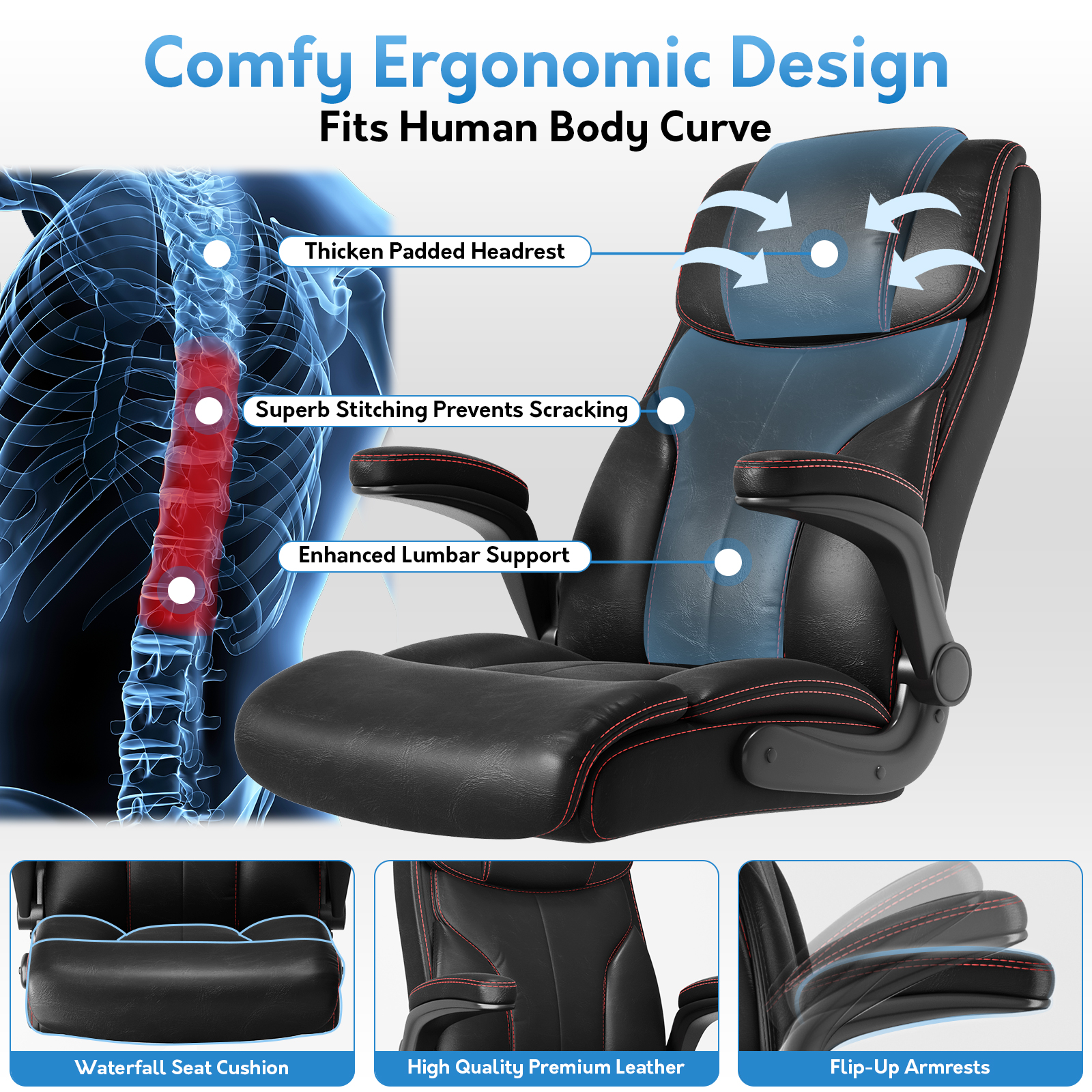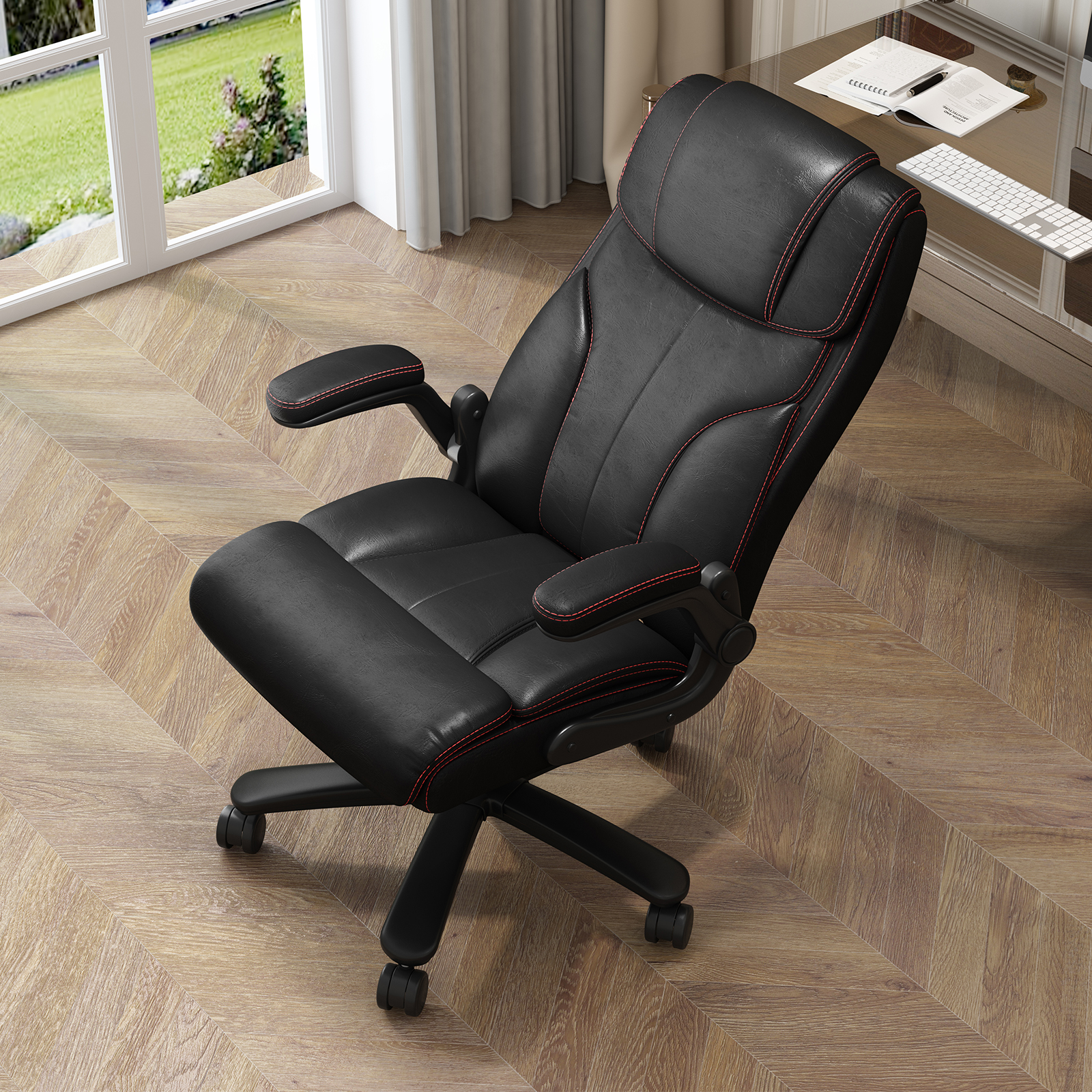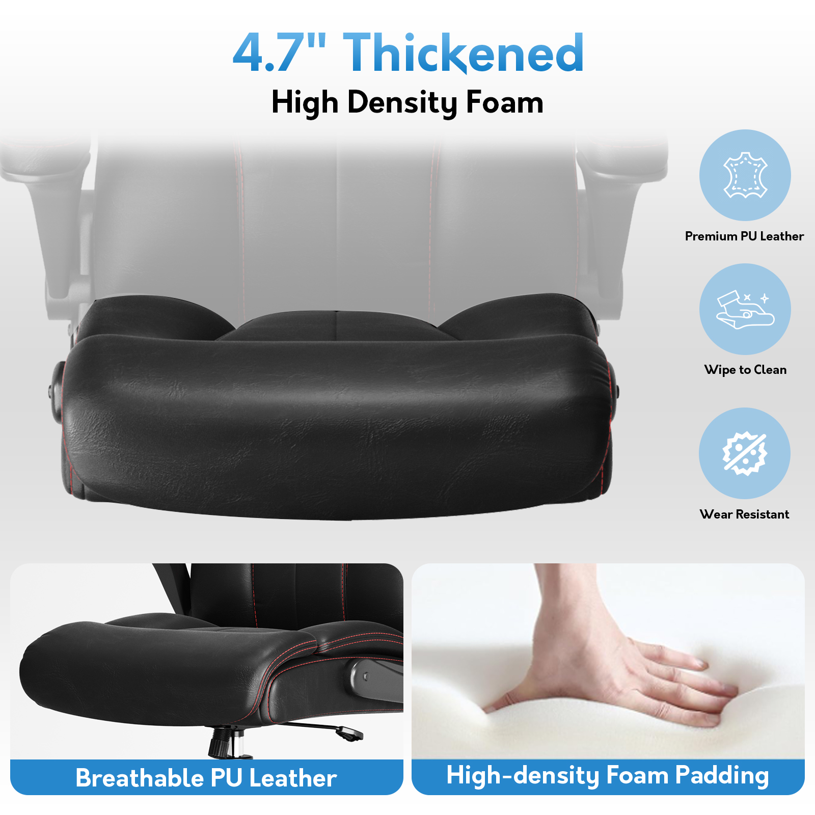 Features thick headrest and body-contouring backrest for enhanced comfort, along with a supportive seat cushion. Versatile Computer Chair: Adjustable height and flexible backrest from 90 to 120 degrees for optimal relaxation. Heavy Duty Executive Desk Chair: Sturdy metal base supports up to 400 pounds, with smooth-rolling wheels that won’t damage floors. Elegant Modern Design: Unique stitching and high-quality PU leather for a stylish yet skin-friendly experience. After Service: Assembles in 15-30 minutes and offers excellent customer support for plus-size desk chairs.